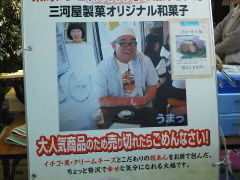店先で三河屋製菓のオリジナル和菓子「しあわせ大福」を販売していました。