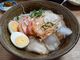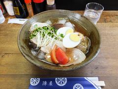 この店は、定番メニューの他に月替わりの「おすすめメニュー」も2つ3つ用意しています。7月から「夏季限定メニュー」も付け加わりました。「盛岡冷麺」は、そのひとつです。麺が、冷やし中華や素麺とは全く違います。緻密に練り込まれた感じの麺で、しっかりとした歯ごたえとコシがあります。春雨のような舌触りと透明感もあります。不思議な麺です。