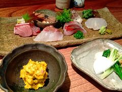 土曜日の夜だったので満席。まずは刺し身盛り合わせと串焼きを何本か注文。どれも見た目も良く美味しい。お酒が飲めなくても、入れるお店だと思います。