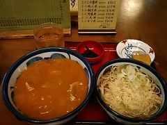 定禅寺通り沿いにあります。ビルの二階で、座敷含めテーブル44席位です。8人掛のテーブルは、真ん中に茶釜が沸いており、お茶に注ぐようになっていました。お昼過ぎには満員で、5人待ちでした。名物はもりそば650円です。追加一枚に付き50円増しで、6枚でも900円です。人気は9種類あるご飯ものとそばのセット(700円〜950円)です。今回は、ミニカレー丼とそばのセット(800円)にしました。丼は可愛い感じですが、食べ答えはありました。そばは極細麺ですぐ伸びるのではと心配になるほどです。カレーはドロッと感が凄く、濃かったです。出汁の効いたカレーを想像していましたが、いい意味で裏切られました。これはこれで美味しかったです。
