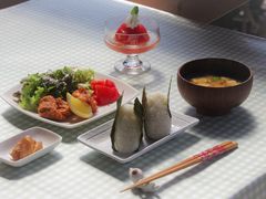 農家さんが直営するカフェです。おにぎりセットは店主の手作りお米で作ったおにぎり(梅とおかかでした!)と味噌汁、日替わりおかず&デザートです。