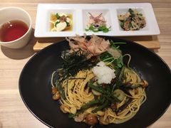 パスタとお惣菜3種とほうじ茶が付いてくるおばんざいのセットを注文しました。薄味ですがお出汁もきいていて美味しかったです。お客さんは女性がほとんどでした。