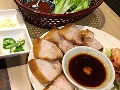1度は食べてみたかった蒸し豚を食べました。肉厚なお肉には味もついています。それを付け合わせの野菜やしょうゆ、味噌をお好みでつけて食べます。スライスしたにんにくも付いています。海外でこの食べ方に慣れている私は、時々こういう物を食べたいので日本でこの食べ方ができるのは、嬉しいです。ソルロンタンは、独特でした。韓国で学んだ時々の言われるご主人のメニューが色々あり、また他のメニューも食べてみたいです。