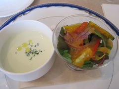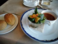 メニューは豊富でコースなどもあり。骨付きもも肉のコンフィがメインになったランチセットを注文しました。これにパン、スープ、サラダがついて1000円、これにデザート&飲み物がついて1400円。手ごろです。