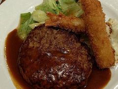 ハンバーグとエビフライの定食を注文しました。ハンバーグはとてもジューシーでエビフライはサクサクして、美味しかったです。