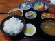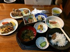 結果、大正解!内容は日替わりですが、この日は馬肉とマグロの刺身、卵焼き、山賊揚げのミニサイズ、焼きタラコ、鯖の塩焼き、サラダ、冷奴、漬物、ご飯と味噌汁がついてこの値段。