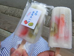 蔵王堂の門前にある「おまんじゅう屋さん」で、季節の桜餅、草餅、花見団子をいただけるのだが、暑いので「吉野本葛あいす@250円」を頂き、吉野駅から戻って来る「蛙飛び行事」の神輿を待つことに!!