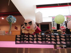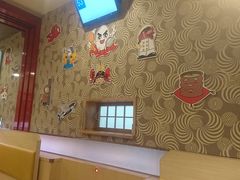 お店の壁にはお寿司のゆるキャラが貼られています。帰りにガチャガチャでシールをもらえますよ。