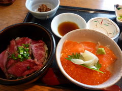 観光客から地元のお客さんで日曜日のお昼には平均30〜40分待ちの状況の中、自動受付機で発券し、隣のお店を覗き・・やらで時間をつぶしようやく案内を受け、メニューと睨めっこ。。結局おすすめの村上牛といくら丼のハーフセット¥1,800を注文しました。村上牛は本当に美味しくて、満足満足・・ですが、いくら丼は冷凍品を解凍した張りの無い回転ずしレベルで残念残念・・蕎麦も普通のスーパーで売っている生麺かな。。結局ここでは少し奮発して、村上牛一直線に絞り込んで楽しむんが、観光で来られる一見さんにはおすすめです。。