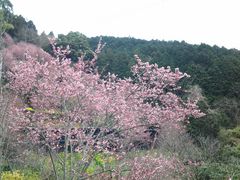 寝府川から早咲きのおかめ桜が咲く道を、こんな狭いところまだ行くの〜と不安になりながら進むと、一面ピンクの谷間にぶつかった。ここが目的地の花見どころとお食事処。土間のある民家の座敷に上がって桃コース(¥1700)を注文した。七輪を囲みながら、自分達で野菜、メインのしいたけ、こんにゃく、おにぎりを焼いて食べるスタイル。しいたけは市販の倍以上の大きさ、厚さで濃厚な旨味が口に広がりジューシーだった。ただ火を使ってても店内は寒かった。