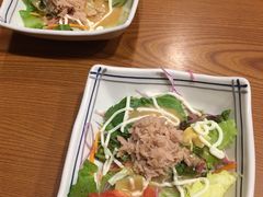 入店は21時過ぎ、店内は清潔感あり、空いていましたよぉ。スタッフさんも気持ち良く迎えてくれて、気持ち良く注文して食事が出来ましたわぁ!此の和食レストラン・チェーン店は、場所・時間を問わずメニューの当たり・ハズレなく、美味しい和食が食べられるので気に入っているお店の一つです。今回はドリンク・バーと「ツナマヨ・サラダ」2人前の他、我が愛妻は「鶏肉の竜田揚げおろし和膳」を、じじいは「Wかつ丼」と「味噌汁セット」などを注文して、シェアしてのんびり美味しくいただきましたぁ!スマホ・メールの10%OFFクーポンを利用して、今回も実にリーズナブルにご馳走様でしたぁ!