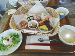午後1時頃行きましたが、女性中心にとても混んでいました。お店の作りもおしゃれ、8日ごとに変わるランチもかわいくてヘルシーでした。当日の内容は大豆中心のメニューで、焼き鳥風のものが美味しかったです。でもちょっと量が少なめな気がしました。