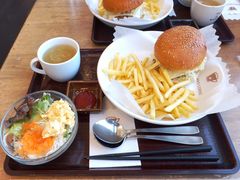 ランチはA(ごはん系)とB(パン系)の2種類あり、それぞれ毎日メニューが変わります。Bにしましたが、この日はハンバーガーがメインでした。チキンカツとトマト・キャベツ・スライスチーズがはさんであり、実にこんもり分厚いハンバーガーでした。パンが香ばしく焼けていて美味しかった。