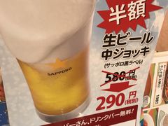 期間限定ハッピーアワーのアルコール半額を利用しての飲み会、2名で利用。1830頃入店で席は5割ほど埋まってます。まずは、生ビールで乾杯、おつまみは、とりあえずポテトフライと甘えび唐揚げ、その後、ちげ豆腐、なすと豆腐の揚げ浸し、とんかつを順次注文、お味はそれなりに美味し。飲み物は、生ビールのお代わり、ハイボールと続き、各自4杯。2時間弱飲み食いして満腹、2名で6千円弱でCP良し。