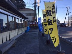 JR内房線の竹岡駅近く、竹岡のヒカリモ発生地のすぐ横に在る磯料理店。「黄金アジ」の幟を見たら食べない訳にはいきません。