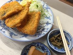 小さなお店なので昼時は混雑しますが、新鮮な魚を使ったタタキ料理や大きなアジフライが有名です。