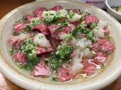思案橋横丁にある人気のお店で常連さんも多いです。名物メニューのヘルシー牛刺しや馬刺し、バイ貝やバッテラなどいただきました。から揚げも美味しいです。