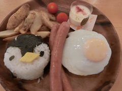 スマイルキッチンでペンギンの顔ご飯に、ハンバーグに目玉焼きを乗っけたやつです。サラダも付いています。