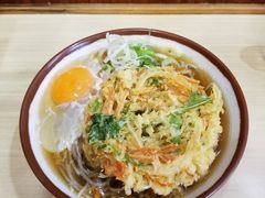 立ち食いそばのお店で自家製のおそばをつかっているそうです。春菊天がのった出汁がきいたおそば美味しかったです。