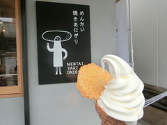 お土産の定番「めんたい」で御馴染の店で、店の前で店員が試食を配っていた。人とスズメが美味しそうに食べていた!?その他として「めんたい焼きおにぎり」や「めんたいソフトクリーム」などを売っている。お土産もここで買えます!!車の方はここで買うのもあり。