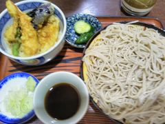 「やぶ金」にて昼食。12時前入店で席は7割方埋まっている。ランチメニューのミニ天丼+盛そばを注文。ほどなく出てきた着丼。盛そばだけでも結構な量、細麺でのど越しよし。ミニ天丼の天タネは、海老、ハゼ?、しし唐、ナス、サクサクでおいし。満腹。お値段手ごろでCPもよろし。