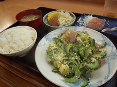 食券を買って店員さんに渡し、広い店内の席に座ります。ゴーヤーチャンプルーはゴーヤーたっぷりでボリューム満点。