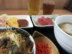 食券を買ってたべる食堂だが、地元の人以外もアリ。ステーキもお値打ち。沖縄そばと牛スジ丼のセットを注文したが、刺身も付いていて、200円で呑めるジョッキ生とで満腹!24時間営業で朝利用もOK。