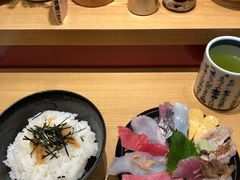 ご飯が入った丼の上に、お魚を盛り付けたお皿が乗って提供されます