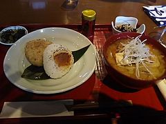 焼きおにぎり豚汁御膳を食べました。十四割という甘口のお味噌を使った豚汁。野菜(具材)本来の美味しさを引き立ててくれるお味噌です。イタリアからの観光客が大勢来ていました。