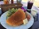 食事系、デザート系どちらのパンケーキもあります。天気が良かったので外のテラス席で。福間海岸が目の前でとっても気持ちがいいです。