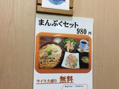 席に着くとすぐ、うら若き女性の声。「あの、まんぷくセット…。ご飯小盛で下さい」ン?満腹希望も小盛りでとは是如何に?お昼時の熟年男性達も「うーんとね」のお仲間に「まんぷくセット、これ得だから」「そう!唐揚げついてるしょ、ほれ。」と次々まんぷく押し。私も早速、チャレンジ〜。結果、相当なまんぷく度合い。家族と唐揚げ分け合っこ。お嬢さんの気持ちが分かりました!女性は炭水化物控えめが宜しいようで。