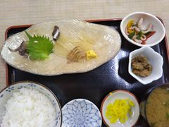 駅二市場二階の食堂にて活イカ定食をいただく。盛られてきたイカは、胴長15センチほどと思われるミニサイズ、府ワタも小指の先ほど。でもちゃんと活イカの透明感とぱりぱり食感、おいしかったです。他に煮物、酢の物の小鉢、漬物、味噌汁、ごはん付きで1270円。この時期、イカ不漁とのこと、このお値段でいただけたので良しとします。