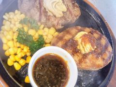 越谷AEONレイクタウンにある「ステーキくに 越谷店」の「ステーキ&ハンバーグ」。ボリュームたっぷりで、人気です。