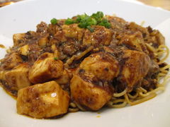 焼きそばは熱々の土鍋のような器に入って登場です。焼きそばがすっぽり隠れくらい、たっぷりと真っ赤な麻婆豆腐が上から掛かります。一般の麻婆豆腐よりも辛さは強く、花椒の痺れが効いた本格派。