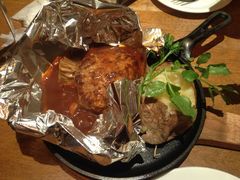 東洋亭の名物包み焼きのハンバーグがとても美味しいです。銀のホイルに包まれたハンバーグはジューシーで肉汁たっぷりです。