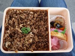新潟から快速べにばなに乗って3時間、米沢駅で食べた駅弁です米沢牛 美味い。ホームのイスに座り舌つづみ、山形新幹線を見送り頂きました。