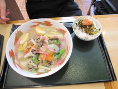 熊本インターの北にあるサービスエリアの定食屋さんで熊本ラーメンが美味しかったです。高菜めしには明太子もついていて熊本に来たという感じがしました