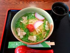 期間限定メニュー「ヤマトポークと水菜の梅うどん」。「梅こころ」のレギュラーメニューである「梅うどん」とは違い、出汁が薄味になっていました。ヤマトポークの味を引き立てるためでしょう。詳細情報をみる