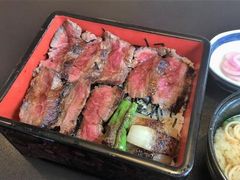 ご飯の上にたっぷり敷かれたレアなステーキ、見た目も綺麗です。