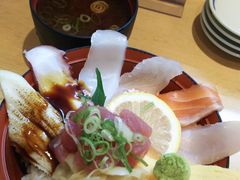 新鮮な切り身魚がいろいろと入った海鮮丼で、ご飯のすし飯
