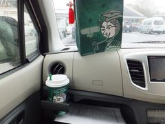 名古屋方面に向かう時には毎回、御在所サービスエリアのスターバックスに寄って、コーヒーをテイクアウトして行きます。季節によって変わる包装パッケージが楽しいですね。今回は、国内では見かけませんが、学士帽をかぶった大学卒業生の絵柄でした。いつもながら、アメリカンなデザインで楽しいです。