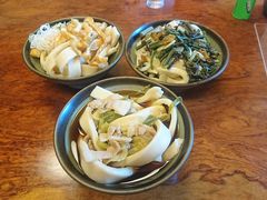 奥から、もりうどん、山菜うどん 手前、肉うどん
