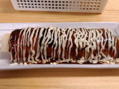 お好み焼きの生地を割り箸に巻き付けていった様なB級グルメです。ソース・しょうゆ味の2通りで、トッピングの種類が複数あります。チーズどんどんとマヨどんどん注文。もっちりした食感で美味しく、どんどん焼き1個でも十分なヴォリュームがあります。大人から子供まで次から次へとお客さんが来ており地元に愛されているお店です。店内は狭いカウンターとテーブル数席なので、持ち帰りの方が良いと思います。すぐそばの霞城公園で食べるのも良いと思います。
