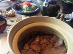 カードが使えなかったけど、とっても美味しいお昼ご飯になりました。軍鶏と豊後牛のまぶし丼をシェアして食べました。ボリュームも味もかなりのものでした。お食事時は込み合います。
