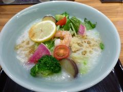 ランチで訪問。注文したのは10種の野菜のベジかゆと蒸し鶏と茗荷のお粥梅味仕立て。ベジかゆには蓮根、紅芯大根、さつまいも、ブロッコリー、ミニトマトなど野菜が盛り沢山。出汁には薄味ながら魚介の味を感じおいしかったです。蒸し鶏と茗荷のお粥のベースは鶏肉の出汁。これに梅の酸味、塩分もいいアクセントになり大葉、茗荷でさっぱり頂けました。当初、お粥だけでお腹一杯になるかなと思いましたがランチでは十分でした。