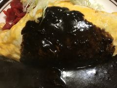 ソフトなドライカレーのオムライスに、黒いカレーソースがかかっています。