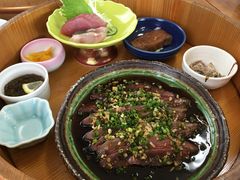 甘めのタレにつけた漬けカツオをご飯にまいて、かけて食べる絶品な定食があります。