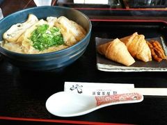 吉野に2店舗ある豆腐屋。中井春風堂で葛餅&葛きりを食べた後、昼食!!気になっていたとうふ店へ!!豆腐ドーナツなどが有名らしく、昼食で人が多かった。夫婦ともに「とうふラーメンセット」を注文。ラーメンはゆばとオアゲがトッピングされ、御稲荷さんが付いてきて1080円。