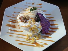 平日のランチで行きました。期間限定?の紫芋のパンケーキをセットで注文。数種類の前菜はどれも美味しくて、季節の素材を使った前菜が楽しめました。パンケーキは焼き上がるまでに時間がかかるので、すぐ注文しておくのがおすすめです。店員さんには40分位と言われましたが、30分かからないくらいで出てきました。紫芋は少し酸味があって、誤魔化してない感じの素材のそのままの味が楽しめました。生地は思ったよりしっかりしていて、上の生クリームは甘過ぎずさっぱりとしていて、とても食べやすかったです。大満足でした。