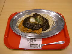 ミートソーススパにとんかつを載せた感じです。
